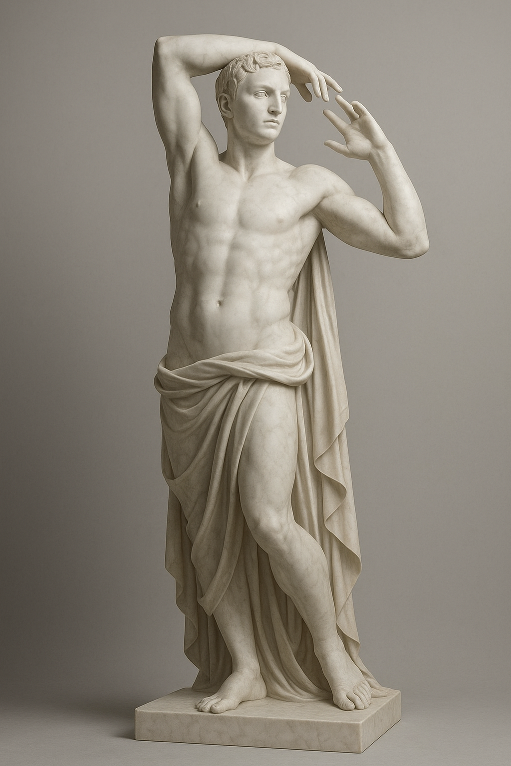 This classical marble sculpture art style embodies Renaissance and Greco-Roman traditions with idealized human forms. Featuring smooth, polished surfaces, anatomical precision, and dramatic drapery, it creates timeless elegance in white stone.