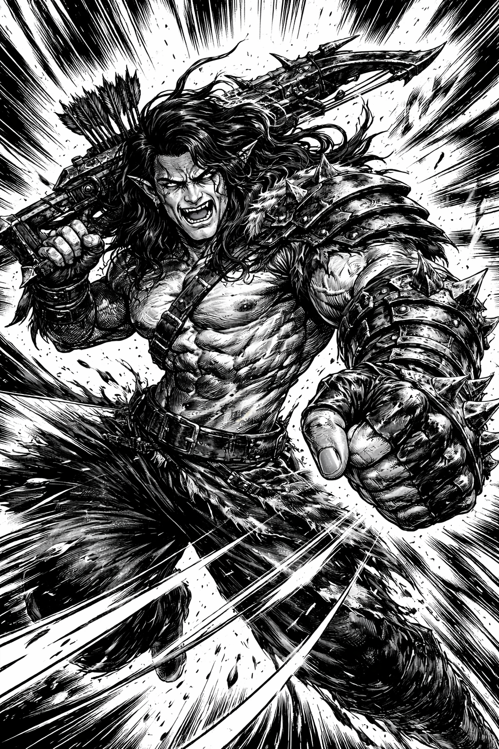 This shonen battle manga art style emphasizes dynamic action through bold ink work and explosive panel layouts. Featuring heavy speed lines, impact bursts, and dramatic facial expressions, it captures the intensity of combat scenes in black and white.