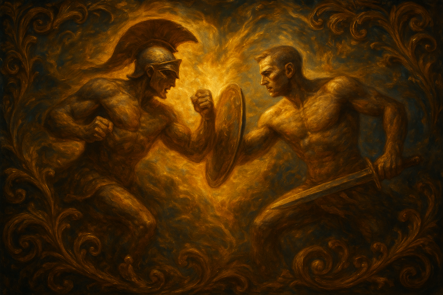 a painting of two men fighting with each other