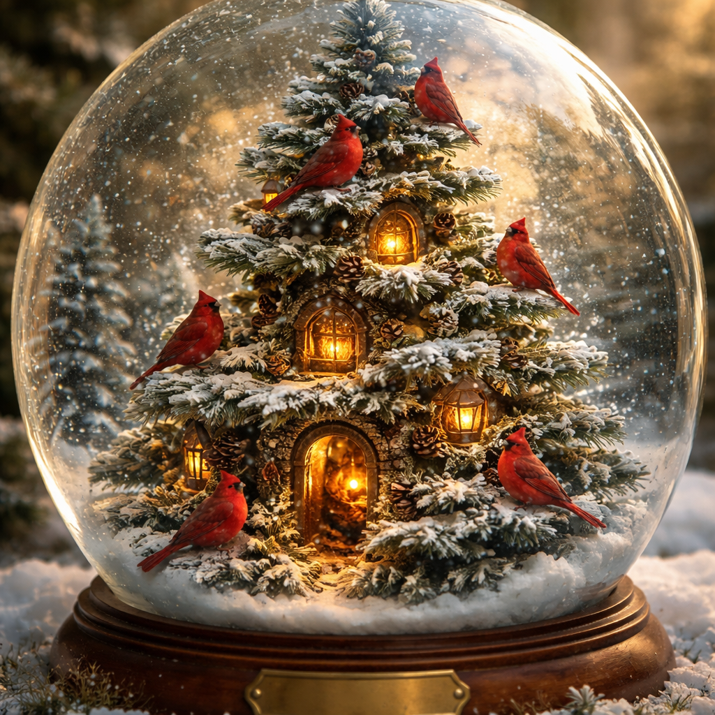 A Christmas tree home for a large family of cardinals in a snowglobe., eye-level view, medium perspective, serene mood, forest green color palette, golden hour lighting, photorealistic style, rule of-thirds composition, high quality, masterpiece, best quality, ultra detailed, sharp focus, highly detailed