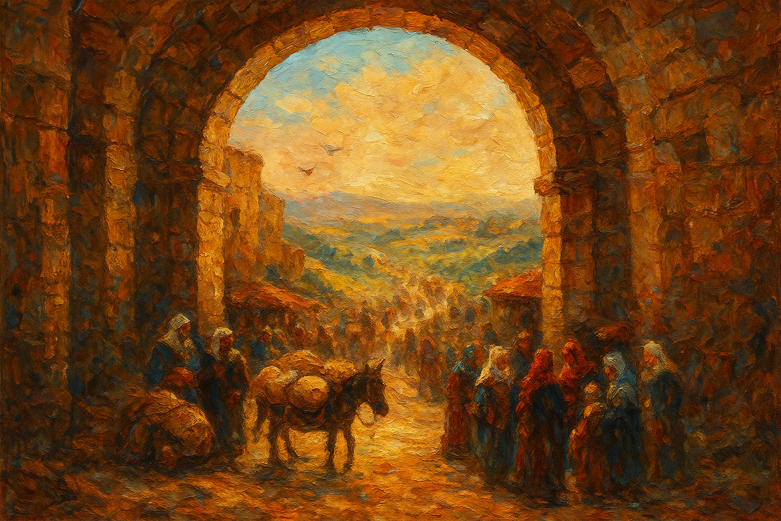 a painting of a group of people standing in front of a stone arch