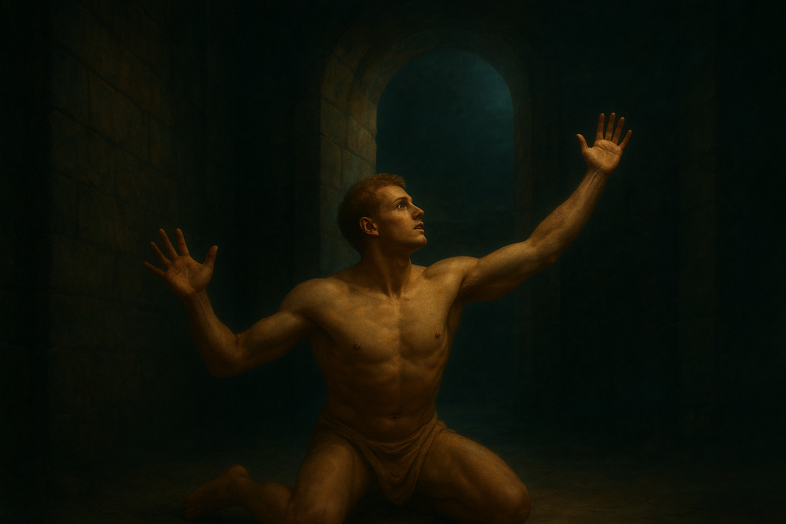 a painting of a man sitting in a dark room