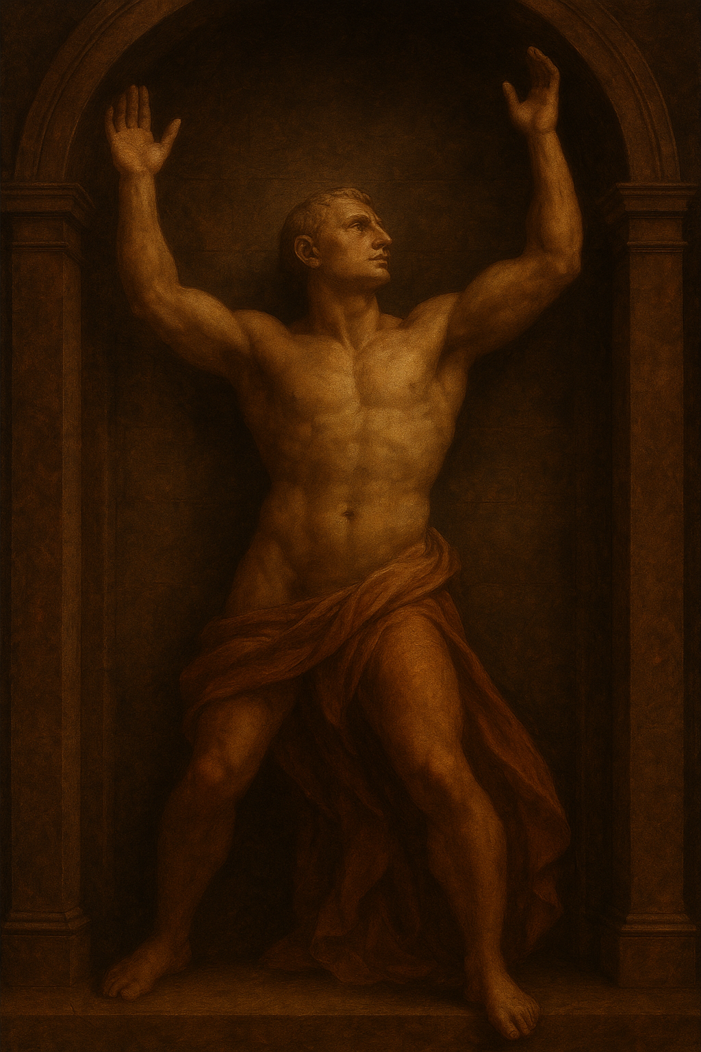 a painting of a man with his hands in the air