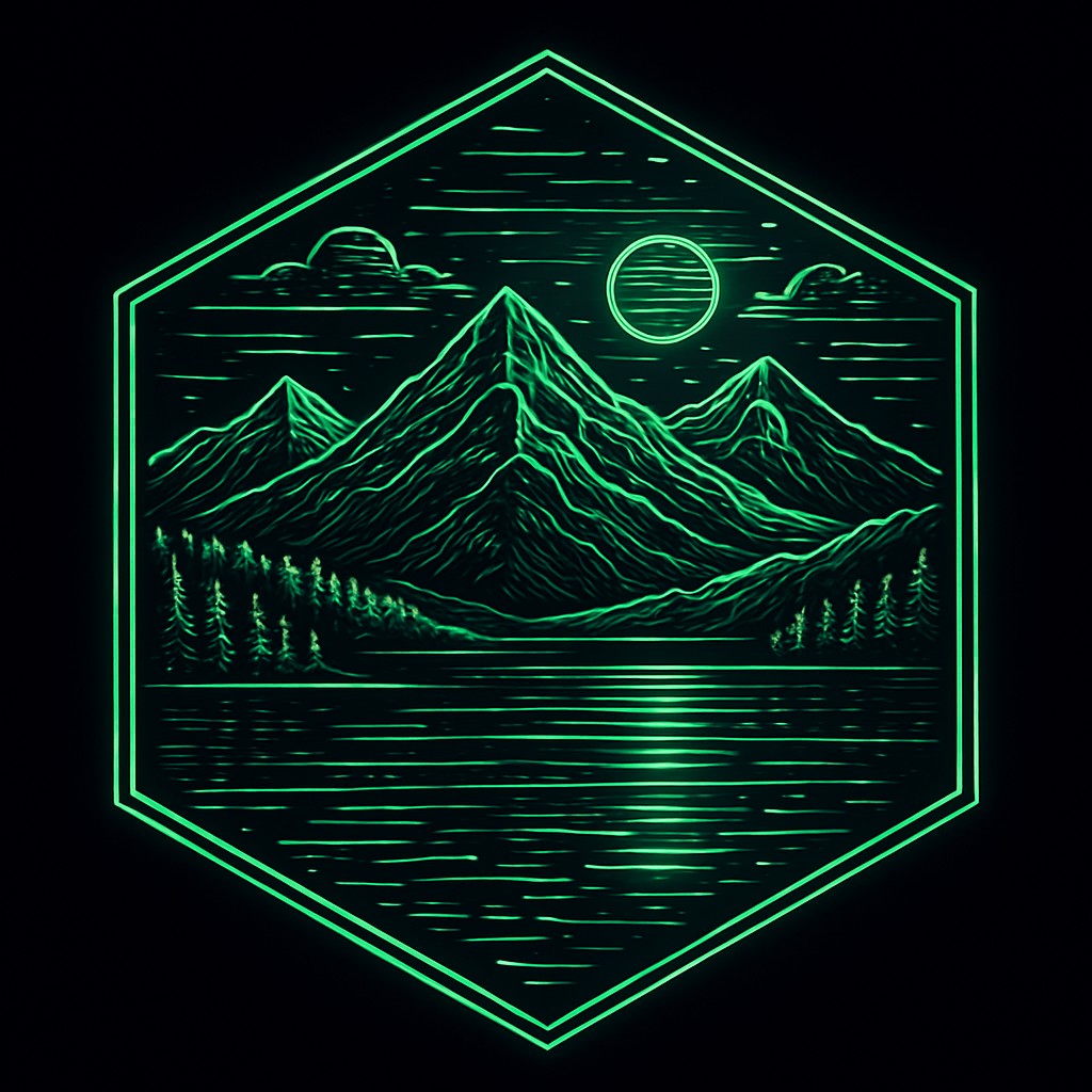 This style integrates organic forms with digital textures, utilizing a vibrant neon color palette against a stark dark background. It features circuit-like geometric outlining and internal patterns composed of alphanumeric code, giving a futuristic, tech-infused glow to natural subjects. The aesthetic emphasizes a blend of bioluminescence and digital data, creating a 'cyberpunk nature' feel.