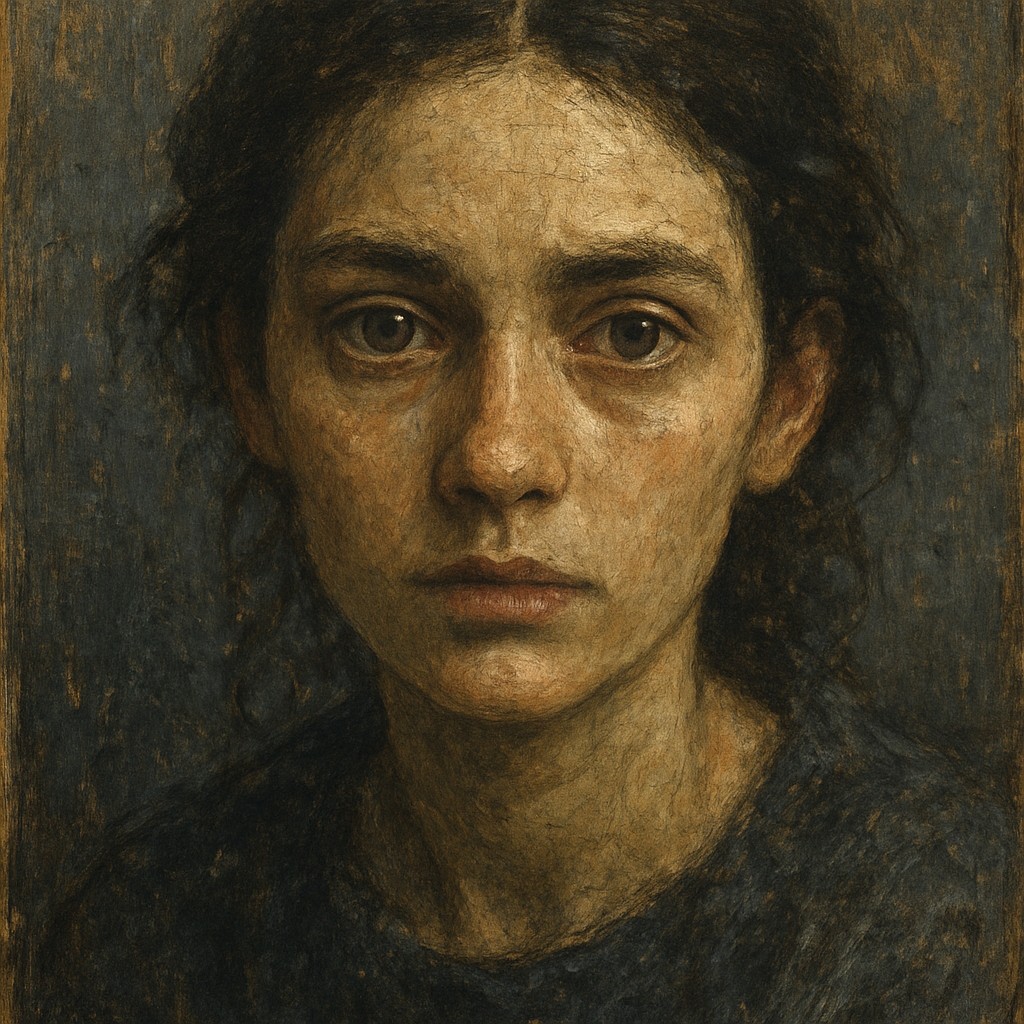 This art style features a weathered and natural aesthetic with visible brushstrokes, like an oil painting. Colors are muted, focusing on deep blues, grays, and earthy browns, with soft, melancholic lighting that makes skin glow.