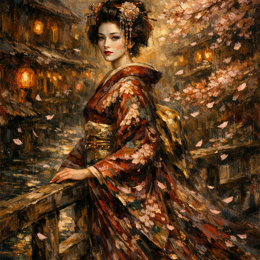 Cinematic Film Style, Romanticism Art Style, a stunningly beautiful and atmospheric portrait of a Geisha in 1930s Kyoto. She is dressed in an exquisite, flowing silk kimono with intricate floral patterns and a wide obi sash. Her face is painted in traditional white makeup with striking red lips and piercing blue-gray eyes. She is standing on a traditional wooden bridge over a stream in Gion, with soft pink cherry blossoms falling around her like snow. The lighting is a warm, golden-hour glow that creates a soft-focus, ethereal background of old wooden teahouses and paper lanterns. Focus on the shimmering texture of the silk, the delicate movement of the blossoms, and a sense of quiet, longing beauty.