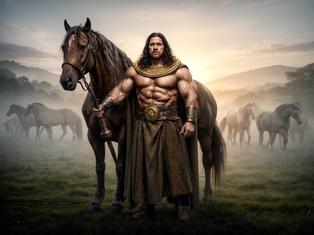 The Dagda, powerful Celtic god, standing with a massive, muscular horse at his side. Earthy robes, bronze and gold torc, long dark hair, commanding presence. Horses moving in the background like living wealth of the land. Misty forest or rolling hills, dawn light piercing fog, mythic realism, cinematic Celtic fantasy, raw authority, natural textures.
