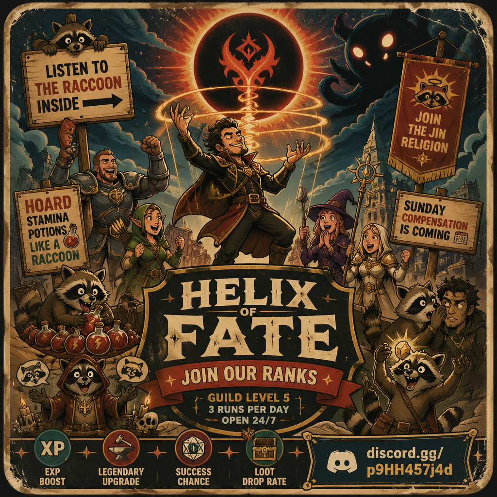 Act as a AAA stylized game artist (Blizzard / Riot style). Create a cinematic cartoon-style recruitment poster for “HELIX OF FATE” with a mix of epic fantasy and humor. 🎨 expressive characters. 🌌 SCENE A medieval fantasy city mixed with a cosmic sky. A giant eclipse in the background. At the center of the eclipse: a glowing red demonic/cosmic symbol. A golden helix spiral of energy connects the eclipse to the ground. 🎭 MAIN ACTION A charismatic leader character is dramatically controlling the helix like pulling strings of destiny… …but slightly exaggerated in a fun way (overconfident pose, dramatic energy). Behind him: a diverse group of heroes (warrior, mage, hunter, cleric), reacting: impressed hyped 🦝 RACCOON HUMOR (MAIN DIFFERENTIAL) Raccoons are part of the scene in a FUN way: one hoarding stamina potions in a pile one holding shiny loot proudly one acting like a “cult priest” one holding a small sign one whispering to a character Expressions should be funny but well integrated (not chaotic). 😂 COMMUNITY MEMES (VISUAL, NOT BLOCK TEXT) Integrate naturally in the environment: “Listen to the raccoon inside” “Hoard stamina potions like a raccoon” “Join the Jin religion” “Sunday compensation is coming” 👉 Place as: wooden signs banners graffiti small props 👁 DARK ENTITY (CARTOON STYLE) A shadowy cosmic creature behind the title: simplified but expressive glowing eyes slightly funny but still mysterious 🧾 TEXT (SHORT & CLEAN) HELIX OF FATE JOIN OUR RANKS Guild Level 5 3 Runs per Day Open 24/7 EXP Boost Legendary Upgrade Success Chance Loot Drop Rate discord.gg/p9HH457j4d ⚠️ RULES Keep composition clean and readable Balance epic + humor (not full meme chaos) Characters expressive and stylized Helix should still feel magical and important Poster must feel like a polished game promo
