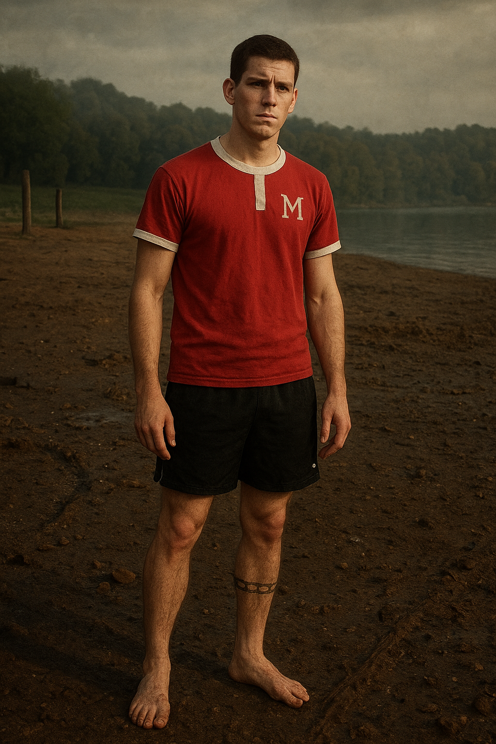 a man in a red shirt and black shorts