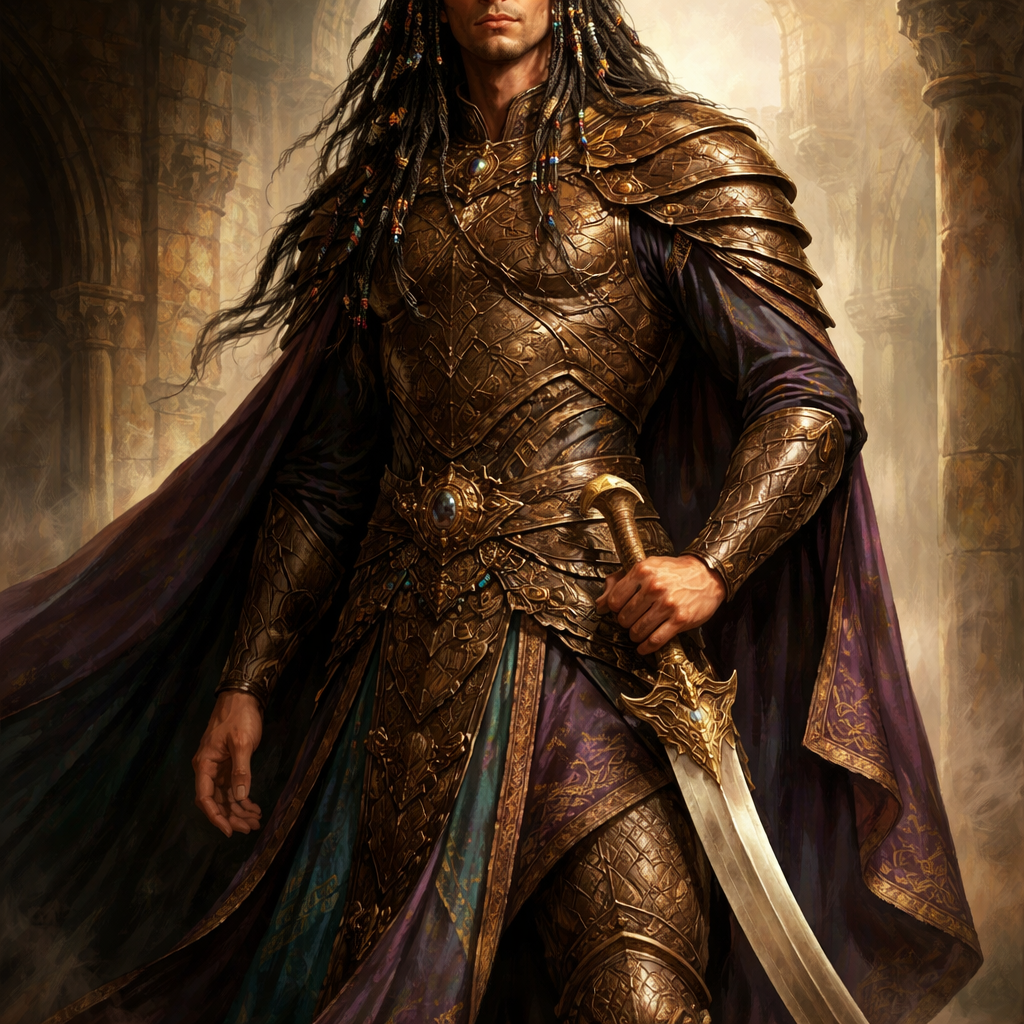 Style: A detailed, photorealistic character portrait in the style of high-fantasy historical cinema, focusing on texture, armor design, and facial structure. The Subject: A full-body portrait of a single Gibeonite lord. He is a figure of imposing, "giant" stature, standing significantly taller than an average human (suggesting 7+ feet), but his proportions are lithe, graceful, and powerful rather than bulky or brutish. Facial Features & Expression: He possesses a noble, almost ageless bearing reminiscent of an Elven lord, translated into ancient Near Eastern features. He has high, sculpted cheekbones, a strong aquiline nose, and intense, deep-set eyes that convey a calculating intelligence and ancient dignity. His expression is calm, watchful, and confident. Hair & Adornment: His long, dark hair is elaborately and precisely braided, woven with hammered bronze rings and polished beads of carnelian and lapis lazuli. Attire & Armor: He is dressed in attire that demonstrates advanced craftsmanship and sophistication. He wears a fitted breastplate of polished bronze, richly engraved with complex, swirling Canaanite motifs (stylized lions, gryphons, and geometric patterns). Beneath the armor, a tunic dyed deep Tyrian purple shows through. Weapons: At his hip hangs a massive, curved khopesh sword, scaled to his immense height, with a hilt carved from hippopotamus ivory and inlaid with gold. Pose & Lighting: He stands in a relaxed but formidable pose of authority, one hand resting on his sword hilt. The lighting is golden hour sunlight, catching the metallic sheen of the bronze armor and the intelligence in his eyes against a neutral, out-of-focus textured stone background.