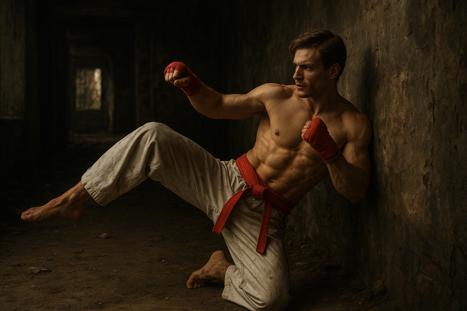 a shirtless man leaning against a wall holding an apple