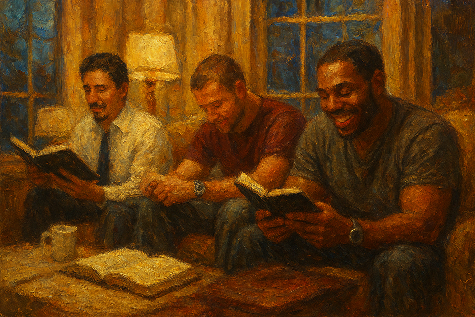 a painting of three men sitting on a couch