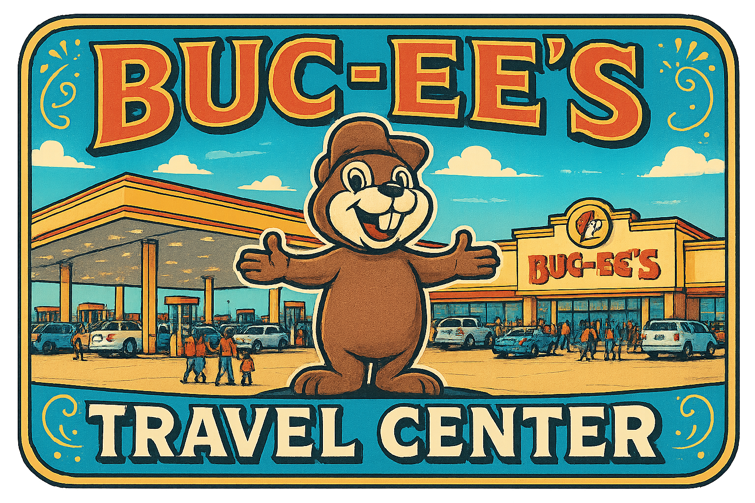 Generate a vibrant, wide-angle image capturing the overwhelming scale and festive atmosphere of a Buc-ee's travel center during peak daylight hours. The central focus should be the massive, iconic Buc-ee the Beaver mascot statue at the entrance, welcoming visitors. Show the enormous, brightly lit gas station canopy stretching across dozens of pumps, with a continuous flow of cars and trucks. In the background, feature the distinctive red-roofed store building with its huge signage. Include details that convey the bustling energy: families walking in, people filling up their tanks, and the overall sense of a colossal, well-organized 'roadside attraction.' The image should highlight its cleanliness, vastness, and the unique, almost surreal experience of stopping at a Buc-ee's.