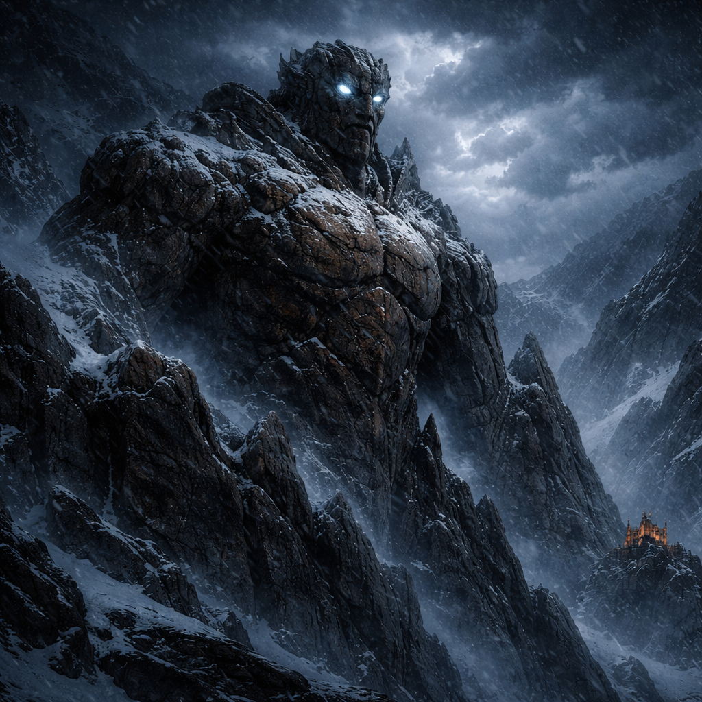Gigantische, mythische Gestalt aus dunklem, rostbraunem Stein, halb mit dem Berg verschmolzen. Der „Eiserne Wächter“ steht reglos auf einem schroffen Gipfel des Braungipfelgebirges. Sein Körper wirkt wie aus massivem Fels gehauen, mit rissiger, verwitterter Oberfläche. Teile seines Körpers gehen direkt in die Klippen über, als wäre er aus dem Berg selbst gewachsen. Seine Augen glimmen schwach in kaltem, bläulichem Licht. Schnee und Eis bedecken seine Schultern und Arme. Der Wind peitscht dichte Schneeflocken durch die Luft. Um ihn herum: steile, dunkle Felswände, verschneite Bergtäler, dichter Nebel zwischen den Schluchten. Es ist tiefste Winternacht. Der Himmel ist wolkenverhangen, nur fahles Mondlicht bricht durch die Schneestürme. Unten in der Ferne sind kleine, warme Lichter von Burg Kronfels zu sehen, winzig im Vergleich zur monumentalen Figur. Atmosphäre: ehrfurchtgebietend, mystisch, uralt, beschützend aber unheimlich. Cinematic lighting, dramatische Perspektive von unten, epische Größenwirkung, ultra detailed, realistic dark fantasy, 8k concept art, matte painting.
