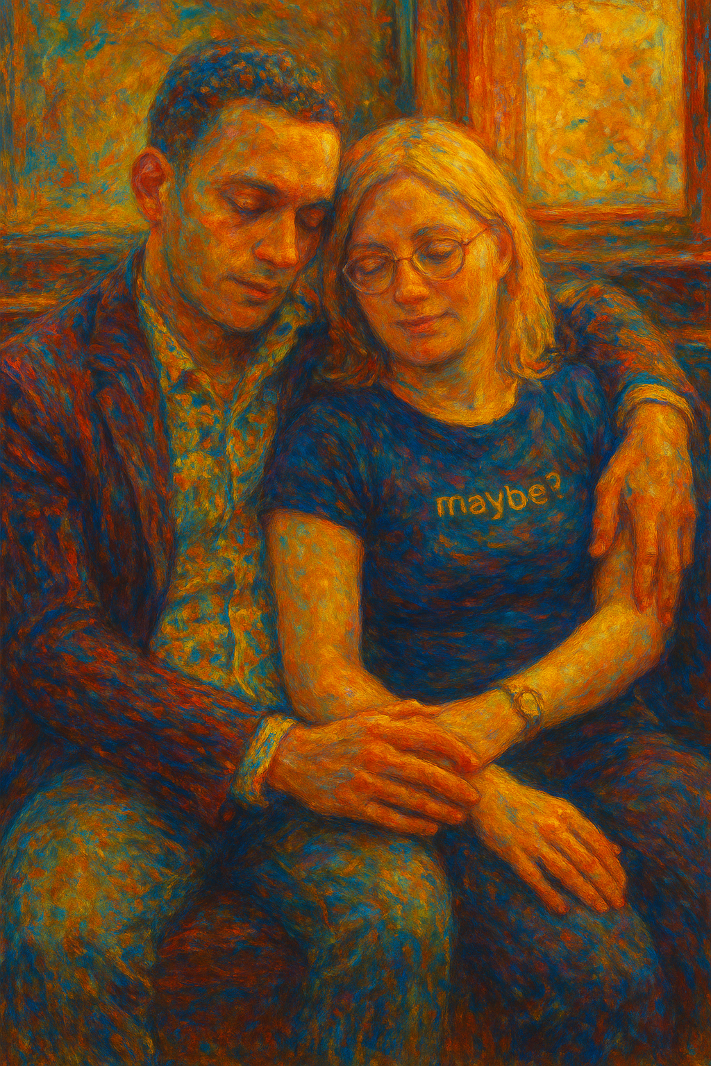 a painting of a man and woman sitting next to each other