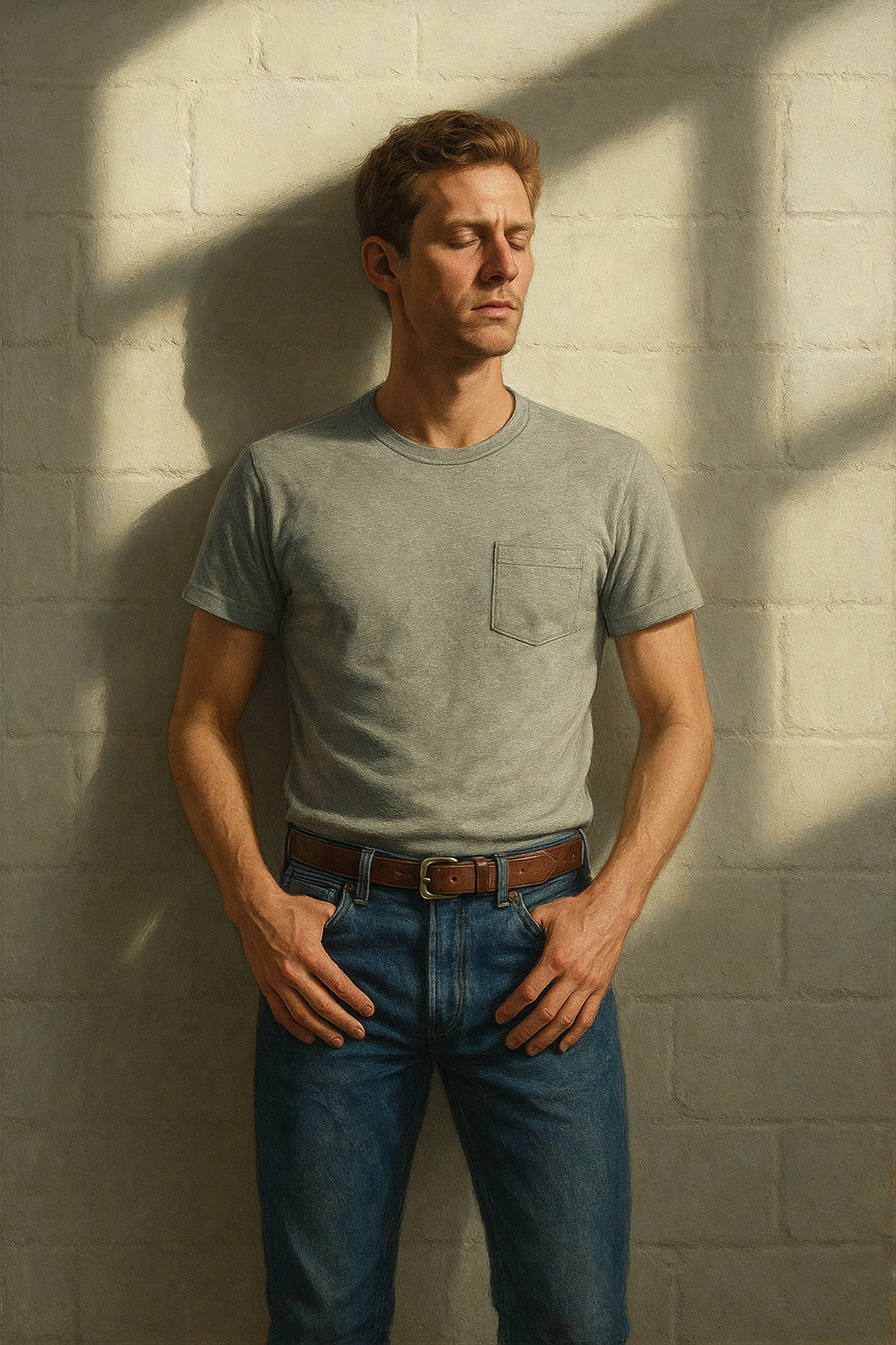 a man standing in front of a brick wall