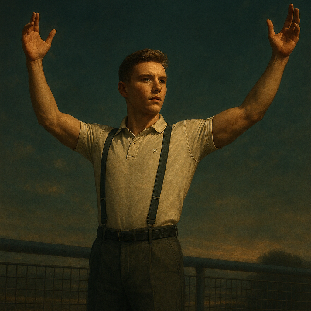 a painting of a man holding his hands up