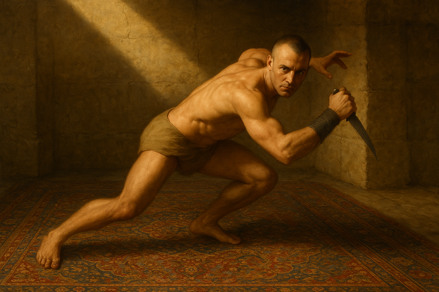 This art style is like a meticulously detailed, dramatic 19th-century oil painting. It features vibrant, lifelike textures, especially in intricate textiles and stone, all lit by theatrical, high-contrast light that cuts through dusty air. Expect sharp focus with rich colors and a smooth, glazed finish.