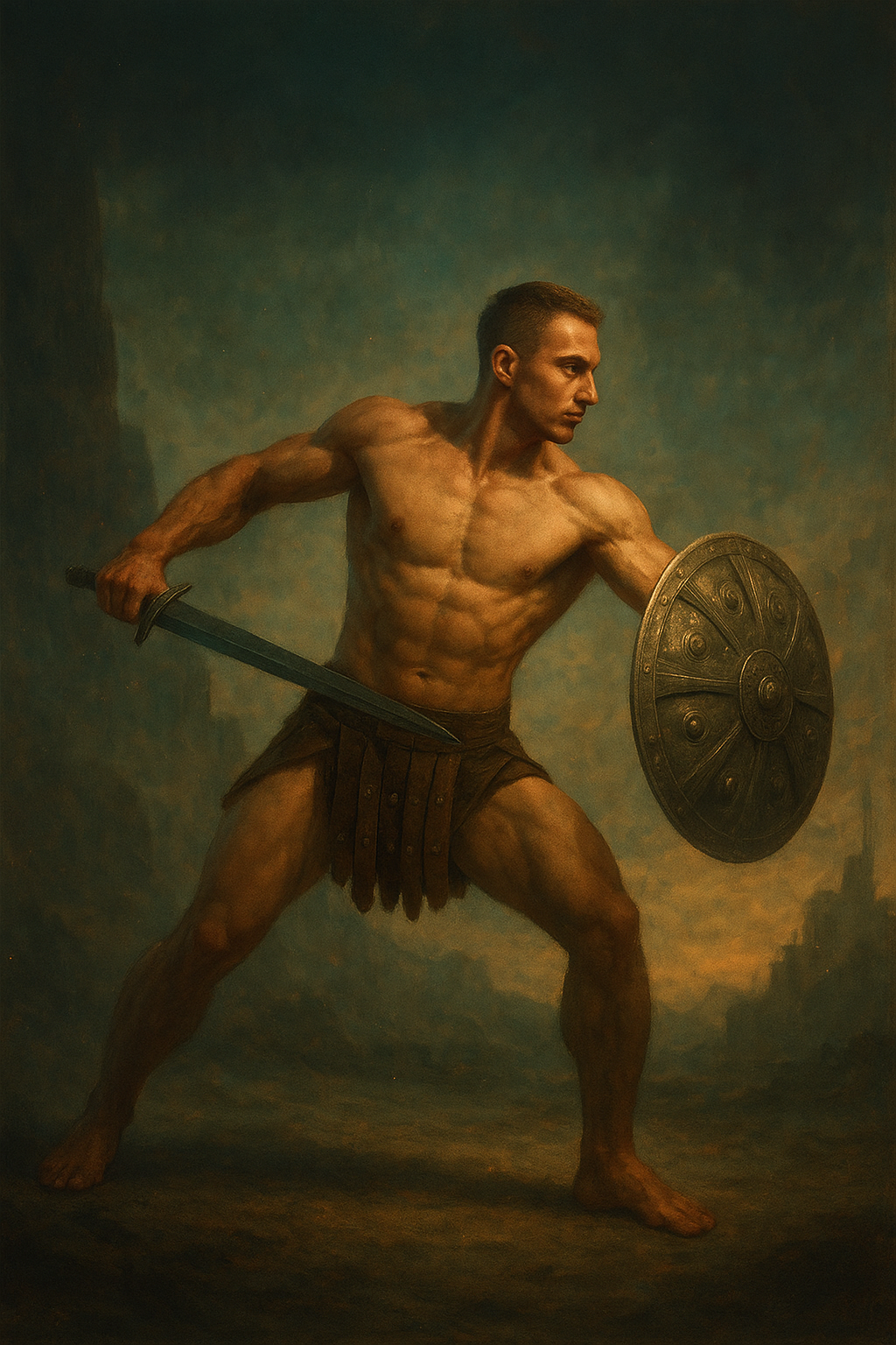 a painting of a man holding a sword and a shield
