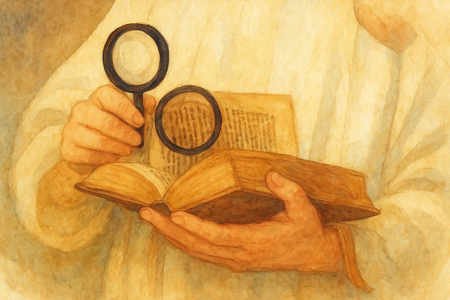 a painting of a person holding a book and a magnifying glass