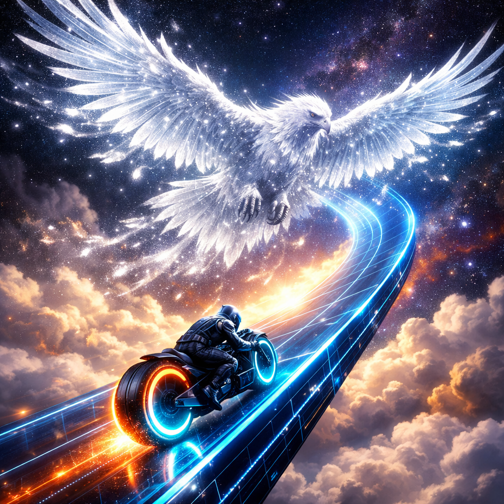 Neon-Futurism Digital Art Style, Bioluminescent Sci-Fi Cosmic Setting, High-Altitude Perspective. An exhilarating shot where the highway feels like it is suspended at the very top of the universe. The Rider & Bike Consistency: The lone motorcyclist—wearing the signature sleek, armored suit and helmet—is tucked tight for aerodynamics on the hubless "light-cycle." The cyan and orange neon rings of the wheels are glowing intensely as the bike reaches top speed. The Path (The Rising Ecliptic): The glowing blue laser-grid highway is no longer level; it is banking sharply upward, curving through a sea of soft, white-gold clouds made of ionized gas. The Cancer Presence (The Eagle): Soaring directly above the rider is the colossal, majestic Celestial Eagle. Its wingspan is massive, stretching across the entire frame. The bird is composed of shimmering white light and silver-blue circuitry. Its feathers look like individual blades of glowing glass, trailing "stardust" behind them. The Action: The Eagle is in mid-flight, its talons tucked and its head forward, appearing to lead the rider through a turbulent nebula. The rider is positioned directly in the "slipstream" of the Eagle’s wings, where the air is filled with glowing white feathers made of pure energy. Atmosphere: A sense of soaring freedom and divine protection. The color palette shifts to bright whites, ethereal silvers, and soft periwinkle, contrasting with the sharp neon of the motorcycle. Lighting: Radiant and "heavenly." The glow from the Eagle’s wings illuminates the top of the rider’s helmet and shoulders in a brilliant white rim-light.