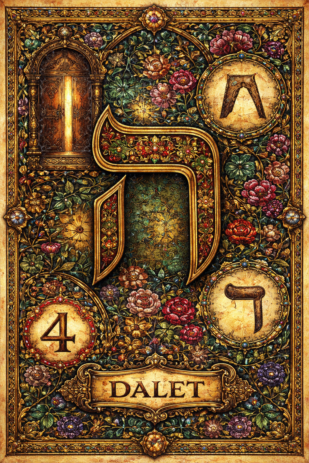 A picture of the Hebrew letter Dalet with the picture of a door, the paleo pictograph, and the modern Hebrew Dalet symbol (ד), the number 4 and the name of the letter "Dalet" . With no other number or letter symbols included