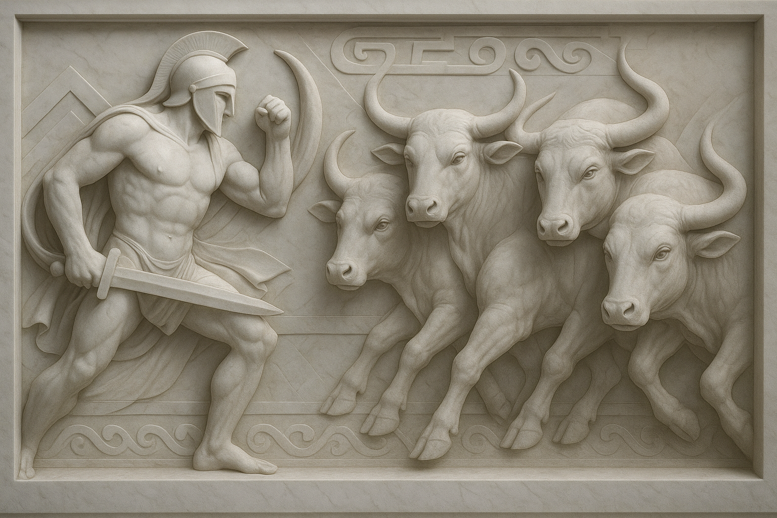 a sculpture of a man with a sword and four bulls