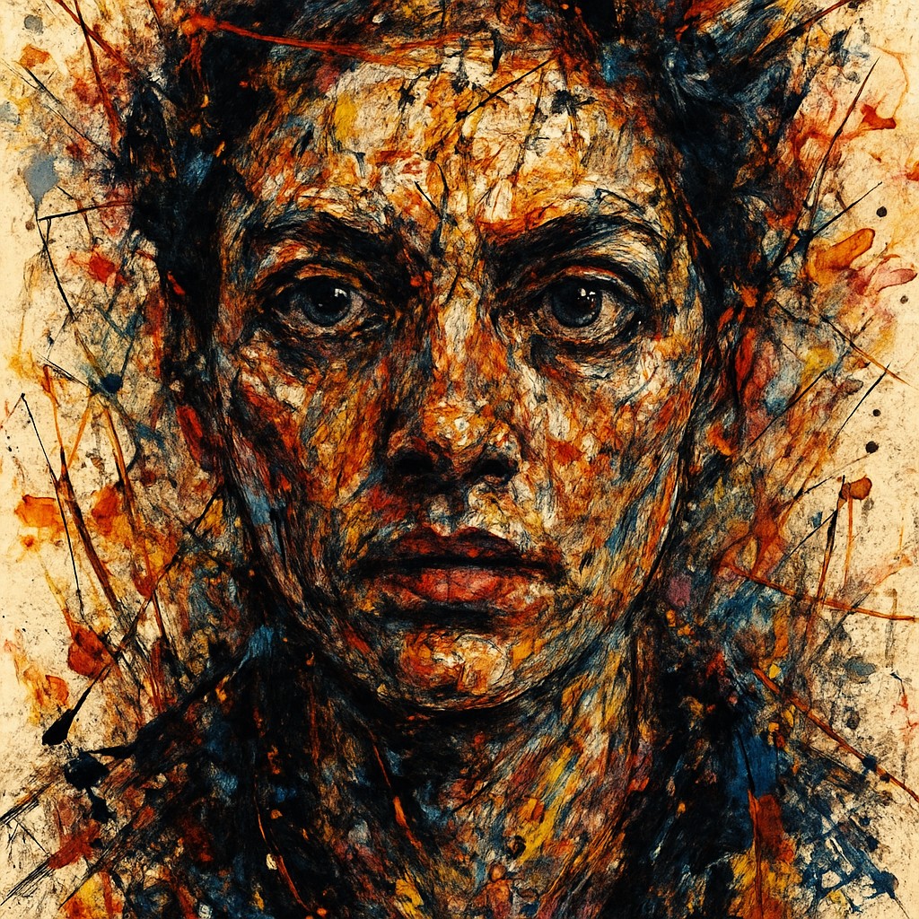 Spontaneous abstract painting emphasizing intuitive mark-making, splashes, and stains without preconceived composition or form.