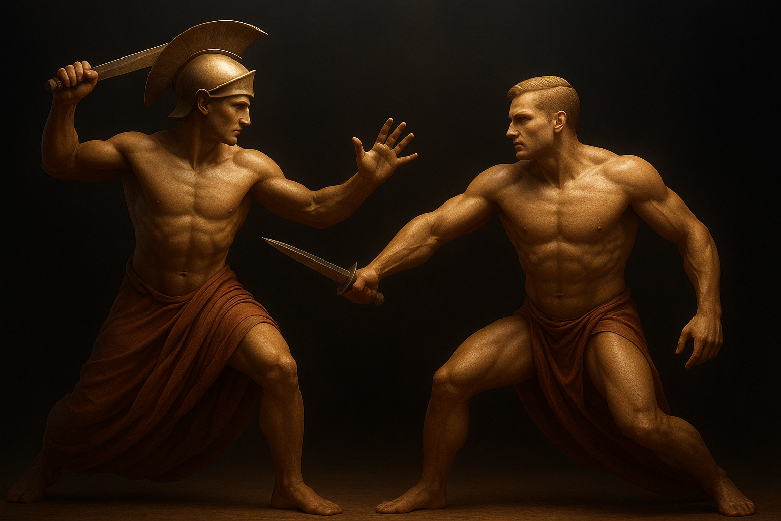 two statues of a man and a woman holding swords