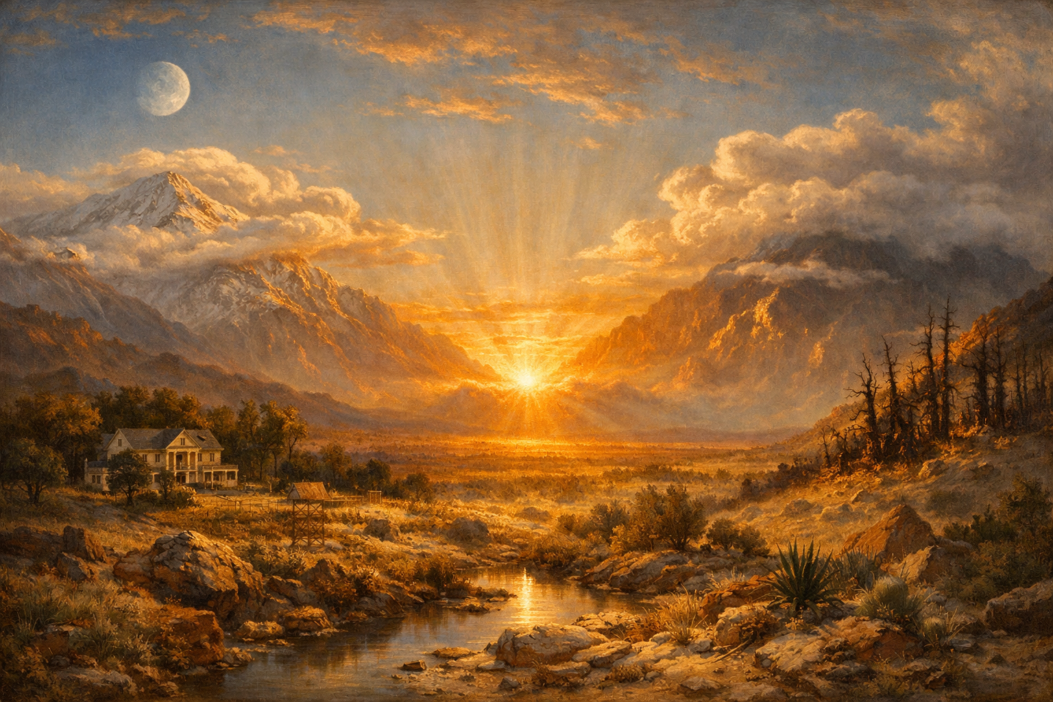 American landscape tradition featuring dramatic wilderness, sublime nature, and detailed realism celebrating untamed American scenery.