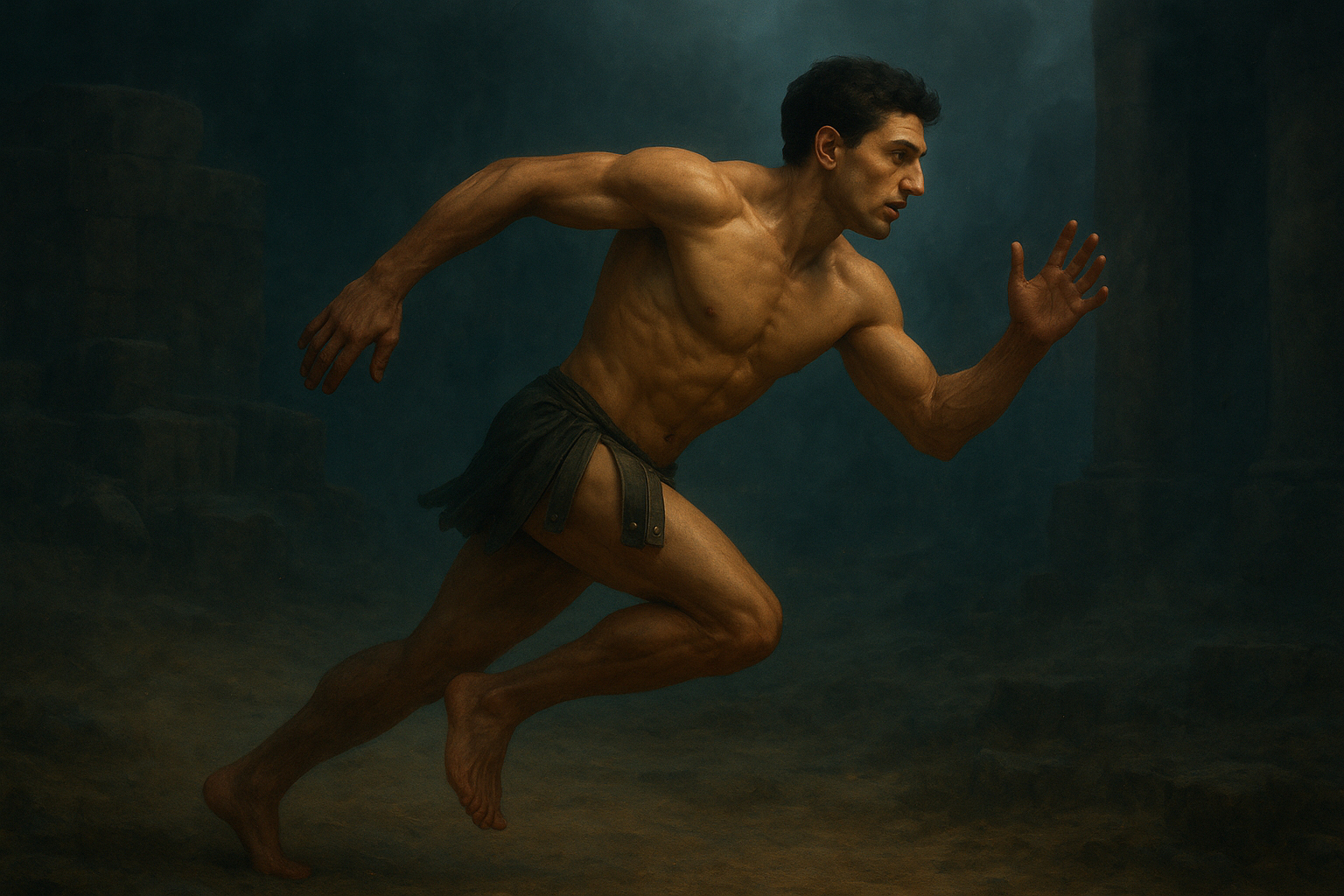 a painting of a man running in the dark