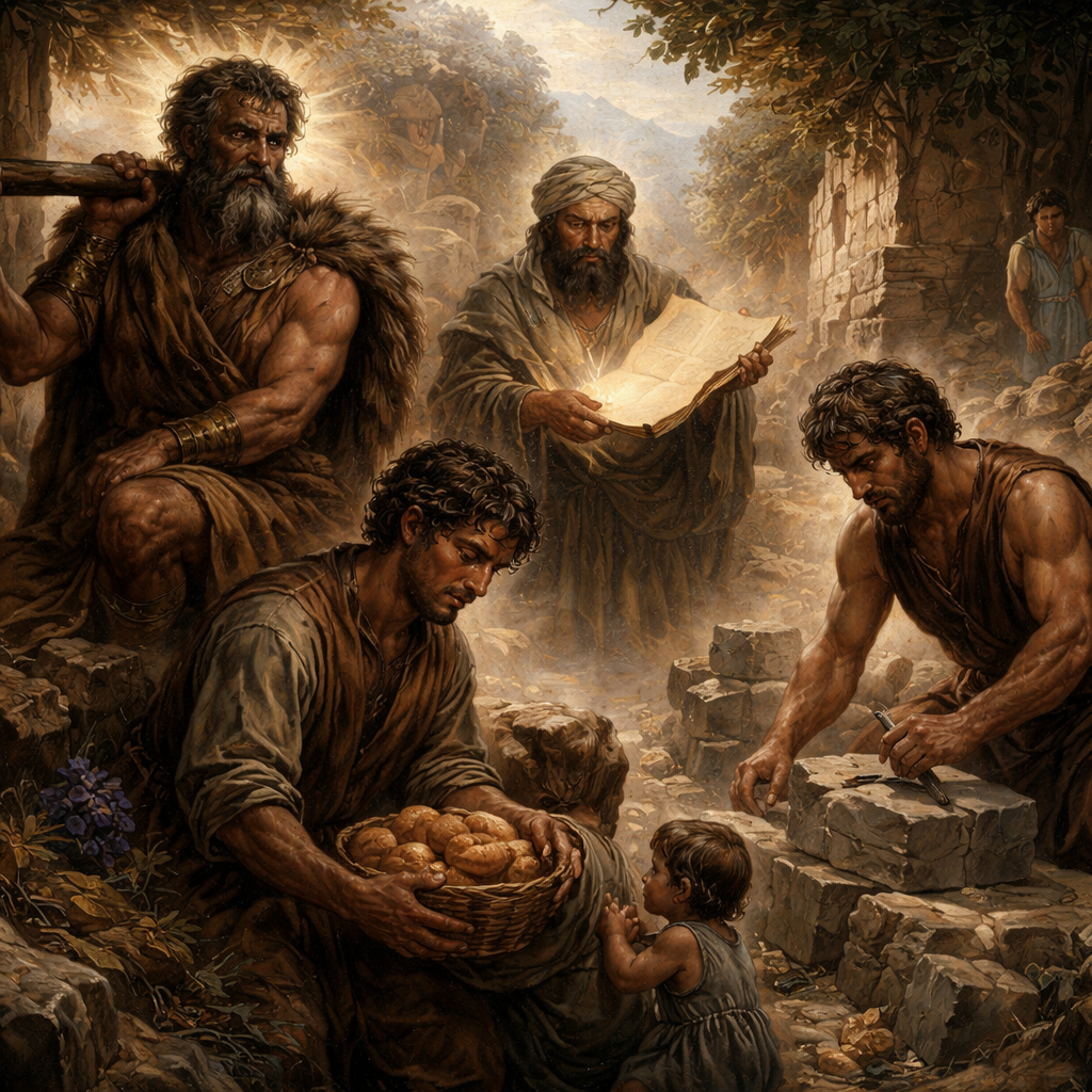 “And the sons of Onam were, Shammai, and Jada. And the sons of Shammai; Nadab, and Abishur.” (1 Chronicles 2:28, KJV) Show Onam as having the gift of strength. Show Shammai as being poor in spirit. Show Jada as having the gift of knowing. Show Nadab as having the gift of generosity. Show Abishur as a mason.