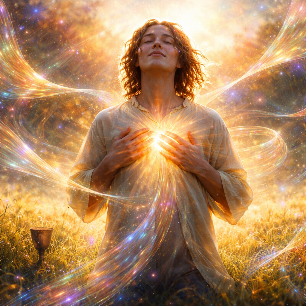 A cinematic, hyper-realistic shot of a person standing in a serene, sun-drenched meadow at dawn. They have their eyes closed and a peaceful, joyful expression, with hands gently placed over their heart. A soft, radiant golden light emanates from within their chest, symbolizing the Spirit. In the deep shadows behind them, a dark, dusty wine goblet sits forgotten and untouched. Swirling, ethereal ribbons of light—resembling flowing musical staves—dance in the air around them. Warm atmosphere, divine glow, 8k resolution, highly detailed, no text, no words.