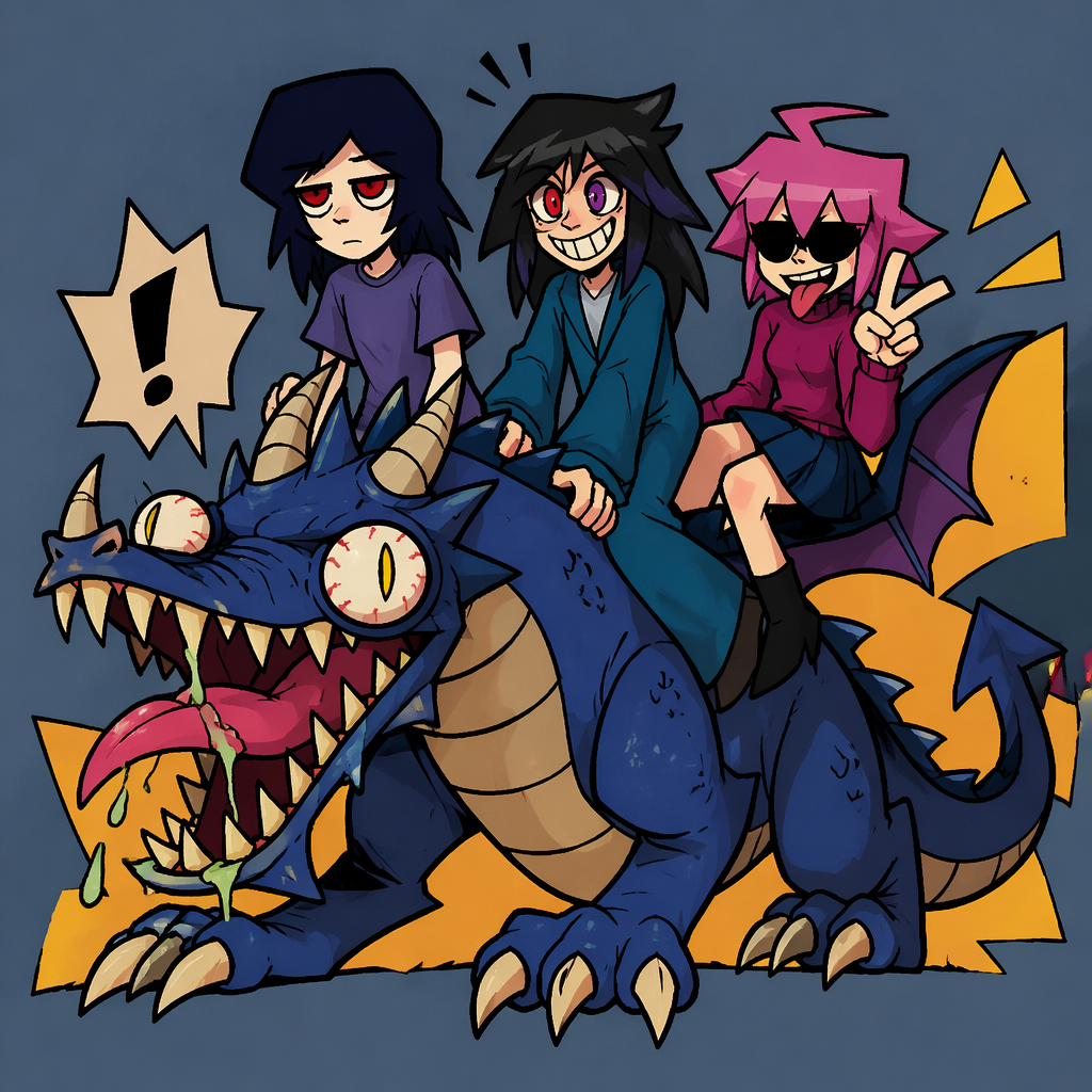 Western cartoon-inspired, exaggerated and slightly grotesque proportions, thick black outlines, flat saturated colors with minimal cell-shading, simplified and distorted shapes, humorous yet slightly unsettling tone. Influences: indie webcomics and Western cartoons. Simplified anime/manga-inspired, proportionate and slender forms, thin but clear black outlines, bright and contrasting flat colors with minimal shading, angular and casual shapes, emphasis on expressive eyes, fanart-inspired aesthetic.