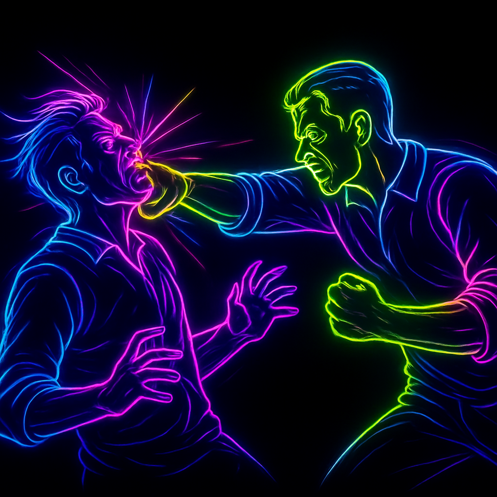 Everything is rendered in brilliant neon colors against pure black, with glowing edges that pulse with electric energy.