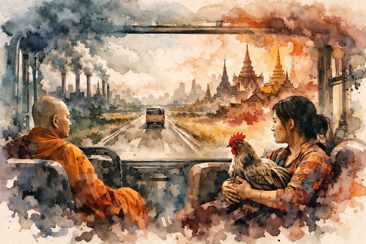 Southeast Asia. Modern day. Back out on the open plain, our bus hurtles toward the city. Smokestacks and temples rise up from the earth; two visions competing for the sky. The woman on my right holds a chicken in her lap; rural wealth for a city friend? On my left a Buddhist priest sits in quiet repose and presides over the world.