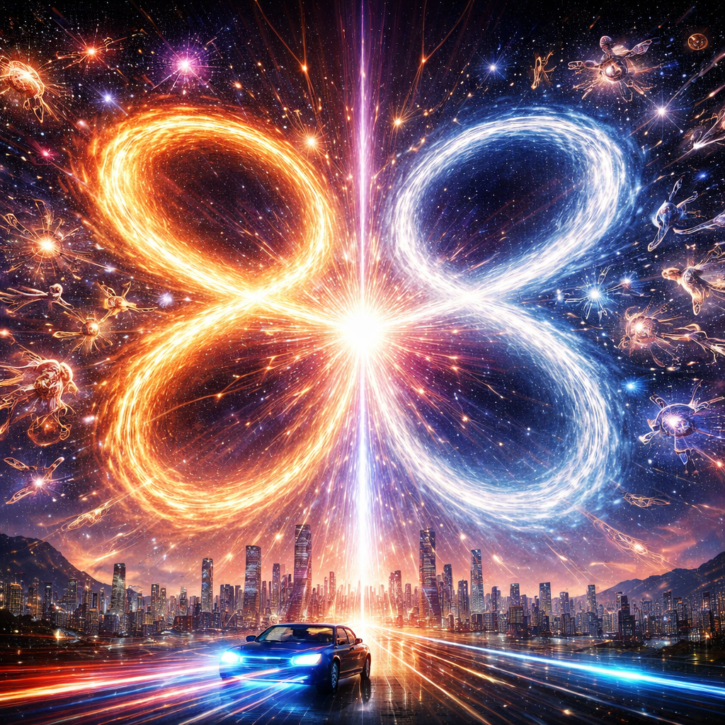 Epic surreal illustration of sun analemma (golden figure-eight path) and lunar analemma (silvery figure-eight) converging side-by-side to form a massive glowing "88" in the twilight sky over a futuristic cityscape, evoking Back to the Future's 88 mph time travel; from the central convergence point, all 88 constellations burst forth like exploding stars and mythical figures in chaotic motion—"the crazy 88" as zodiac warriors and celestial beasts emerging with energy trails, flux capacitor sparks, and DeLorean speed lines; dramatic starry background with nebulae, high detail, vibrant colors, sci-fi fantasy blend, cinematic lighting with god rays and volumetric glow
