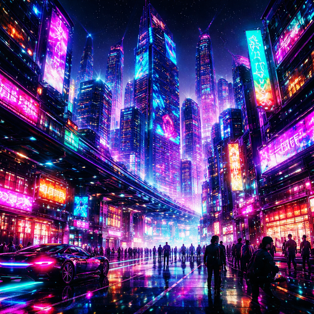 A futuristic anime style with vibrant neon colors, high-tech elements, and urban dystopian aesthetics. Features bold contrasts and electric lighting effects.