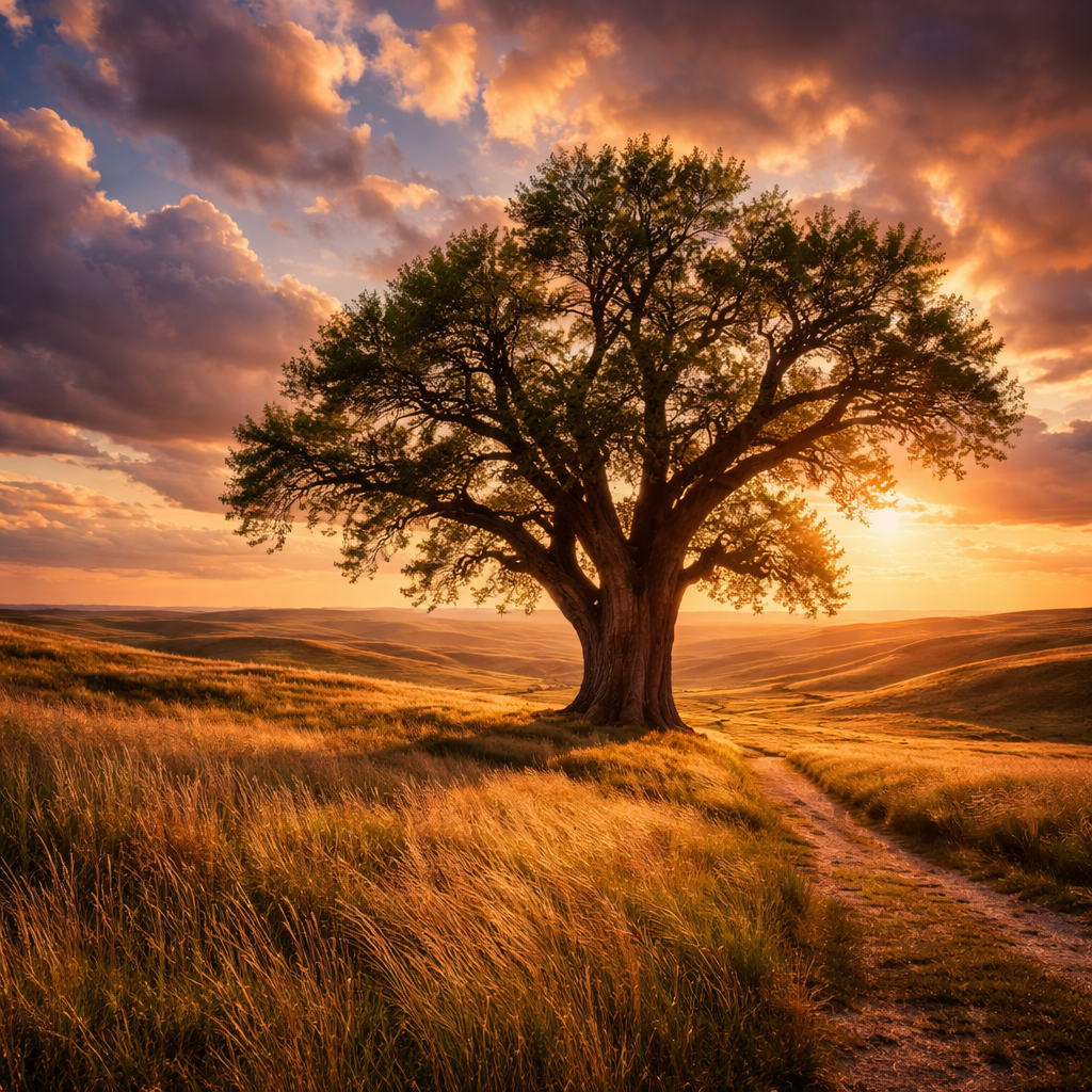 Epic Landscape Photography Style, Wide-Angle Lens, Golden Hour Lighting. A profound, sweeping photograph of a single, colossal ancient Eastern Cottonwood tree standing isolated in the center of a vast expanse of the Nebraska rolling highlands (Sandhills). The Tree: It is massive and gnarled, a true sentinel of the plains, with a thick, deeply fissured trunk and sprawling, asymmetrical branches shaped by years of constant wind. The Environment: The surrounding landscape is a sea of undulating, gentle hills covered in knee-high mixed-grass prairie that glows coppery-gold and sage-green in the late afternoon light. The grasses are visibly swaying in the breeze. A faint, winding dirt track leads toward the horizon. The Sky & Light: The sky is immense and dramatic, taking up two-thirds of the frame, filled with textured cumulus clouds catching the brilliant oranges, deep purples, and soft pinks of the sunset. The light is warm, casting long shadows across the folds of the hills. The mood is quiet, vast, and solitary.