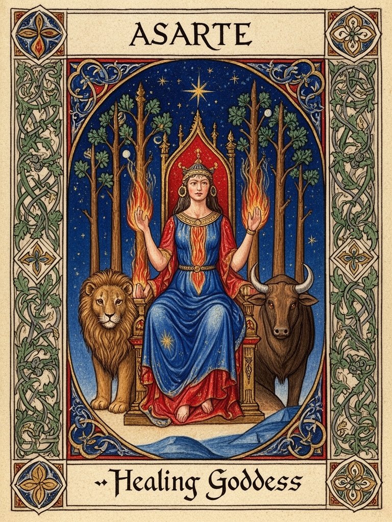 Made a design of Astarte Canaanite Goddess with asherah poles on surrounding her. She sits on a throne with a lion on one side and a bull on the other of the throne. They sit on the edge of moonlight where love becomes force, and beauty becomes command. Below the image add the text "Healing Goddess" using an ancient style that recalls Greek script. Above the design add the text "ASARTE" Astarte is one of the oldest goddesses of the ancient Near East a celestial queen of love, fertility, war, and sovereignty. She rules with a gaze of starlight and hands that both heal and burn. The design is made to look like a pendant or medil honoring her radiant complexity. She is the mother goddess woman crowned with planets, adorned in sacred fire, and feared by kings. As the night star rises, so does her voice a hymn of sensuality, rebellion, and divine embodiment.