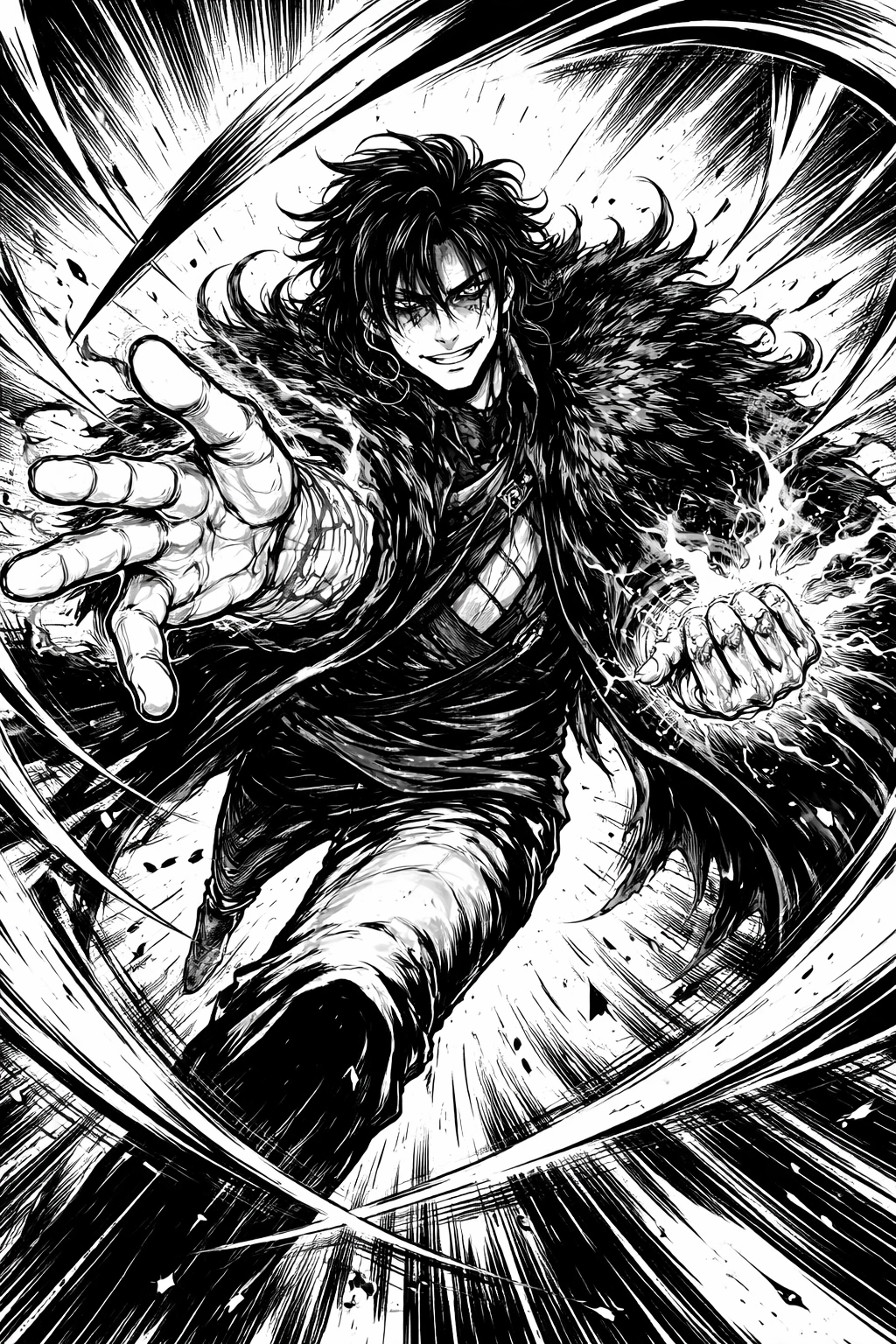 This shonen battle manga art style emphasizes dynamic action through bold ink work and explosive panel layouts. Featuring heavy speed lines, impact bursts, and dramatic facial expressions, it captures the intensity of combat scenes in black and white.