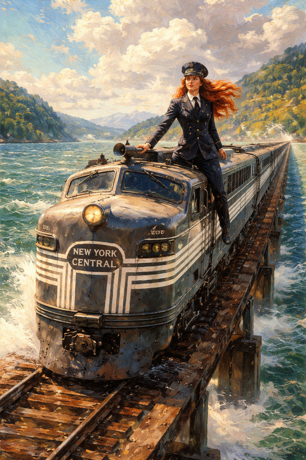 Create an image of the New York Central Railroad EMD E8A #4085 iconic locomotive crossing the Hudson River. Standing on top of the locomotive is a lady with long red hair and a conductor's hat on her head in traditional uniform for the period.