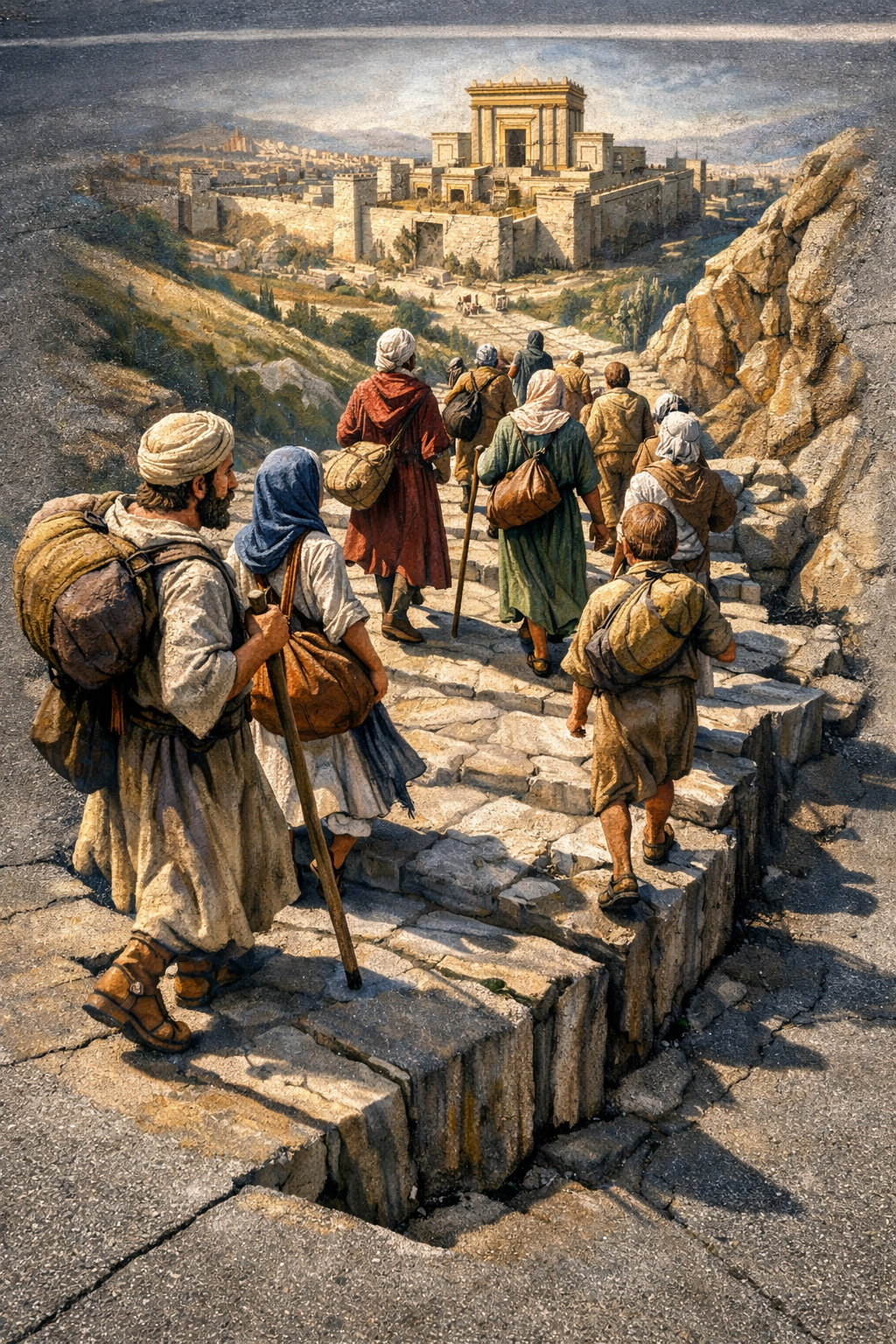 In Old Testament times a group of 12 - 15 Hebrew men and women on pilgrimage ascend a steep road toward Jerusalem and the Temple, headed for the feast of the Passover.  They each carry their own bag, sachel or bedroll.  Anticipation fills the air as the set out on their journey.