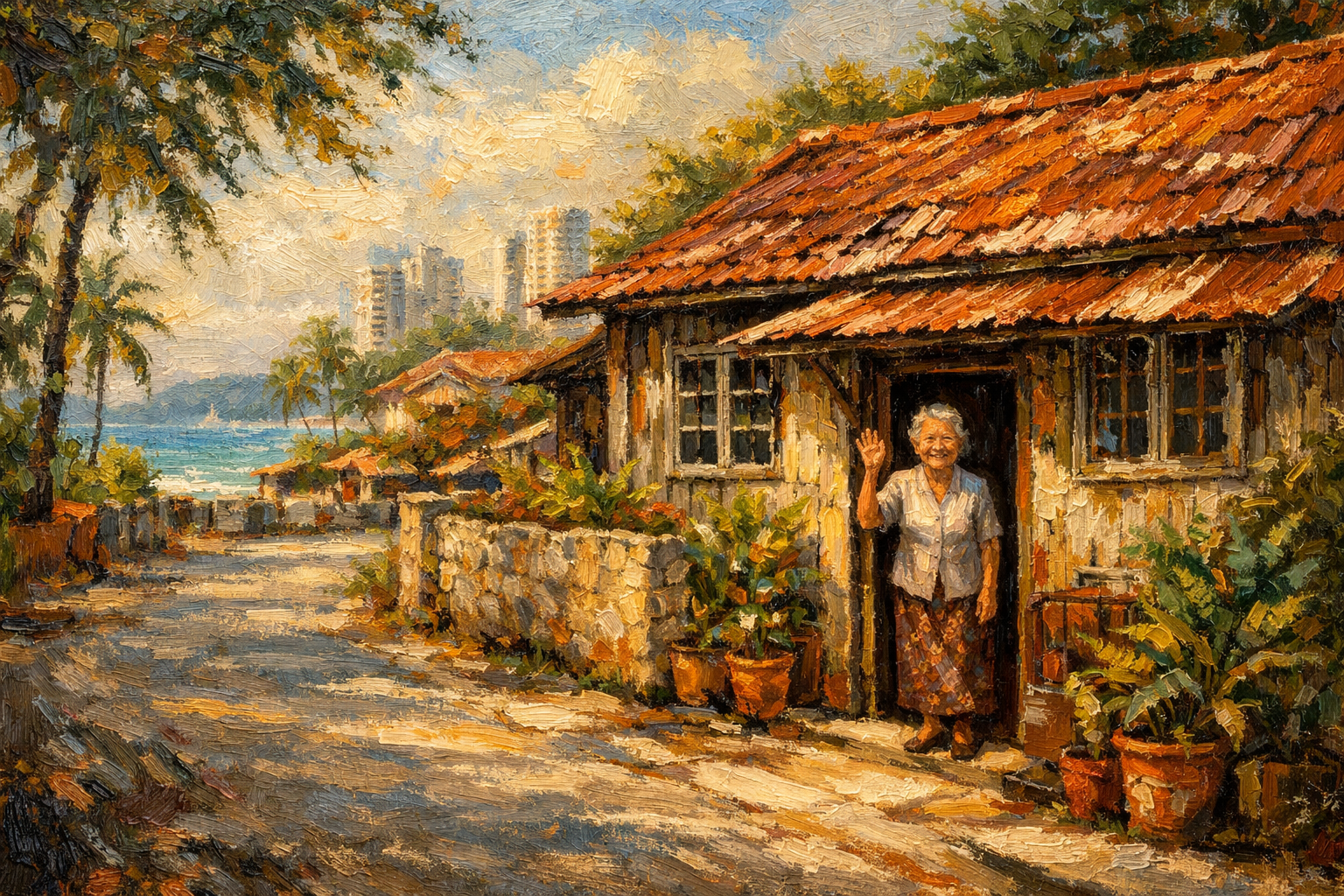 In Penang, Malaysia. Wing Sun's Grandmother is elderly and lives in Penang, on the island. Grandma's house is in a quieter part of the island, closer to the coastline where the sea breeze can be felt through the wooden windows. It's near the ocean, in Tanjung Bungah where there are old-style homes and a slower pace of life. There are many resort "homestay" hotels, and also some high-rise condos, but Grandmother's house has been there many years. Wing-Sun's mother grew up in that house, near the beach, with the ocean breeze. We see the house from down the street with Grandma standing in the doorway greeting us.