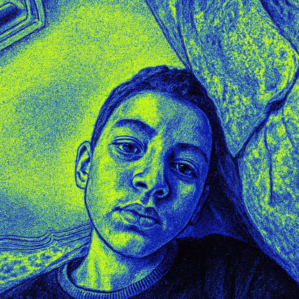 This style is characterized by a stark, high-contrast palette predominantly featuring vibrant blues and greens, often with an inverted coloration effect. The imagery exhibits a gritty texture and strong color quantization, leading to a pixelated or grainy appearance. Forms are defined less by subtle shading and more by the abrupt juxtaposition of these intense, often complementary, hues, creating a digital and somewhat distorted sensory experience. The overall effect is raw, electric, and surreal, emphasizing sharp edges and an almost monochromatic yet highly saturated feel.