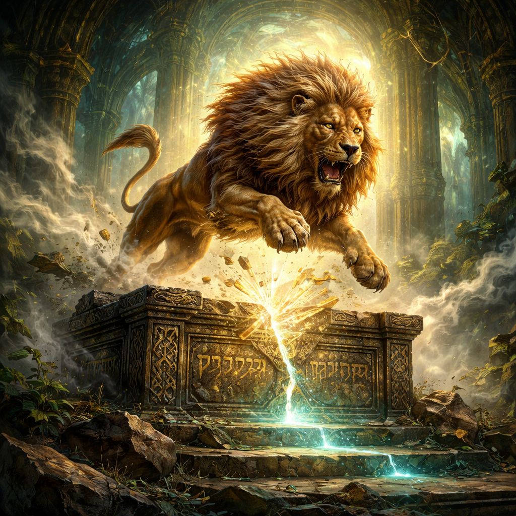 A hyper-realistic, majestic golden Lion of Judah leaping powerfully over a crumbling ancient stone altar. The altar is engraved with Hebrew letters and surrounded by drifting incense smoke. As the lion "springs out," the heavy stone of the altar cracks under its paws, revealing a path of brilliant celestial light. Cinematic lighting, dramatic shadows, baroque art style, 8k resolution, divine and regal atmosphere.
