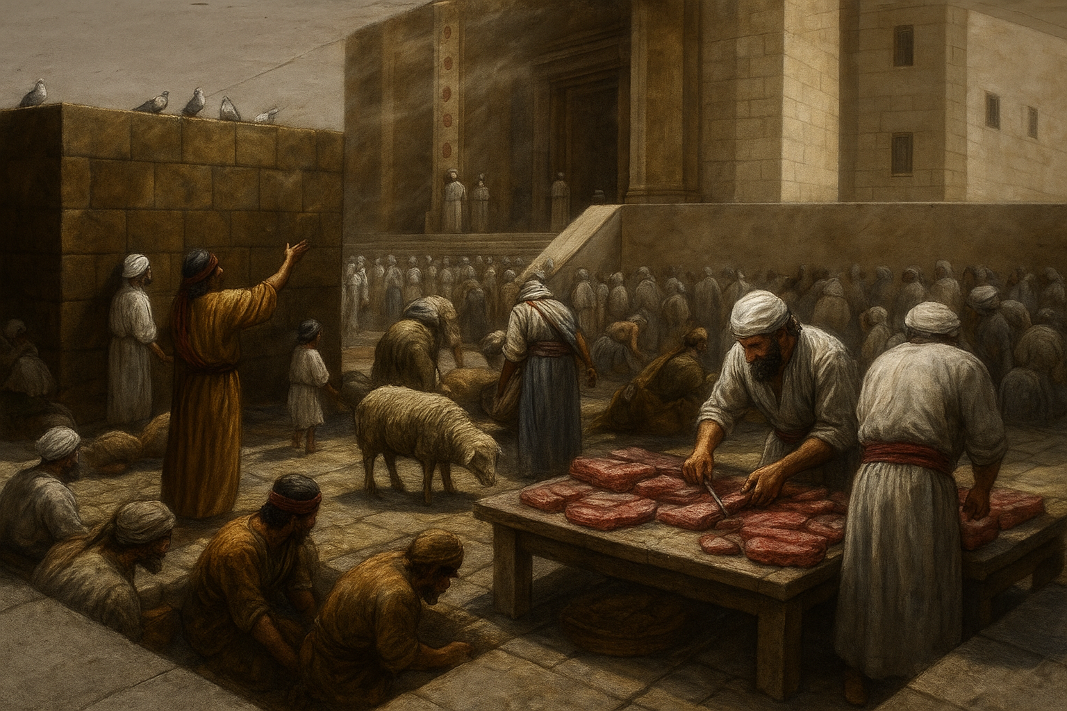 a painting of a group of people standing around a table