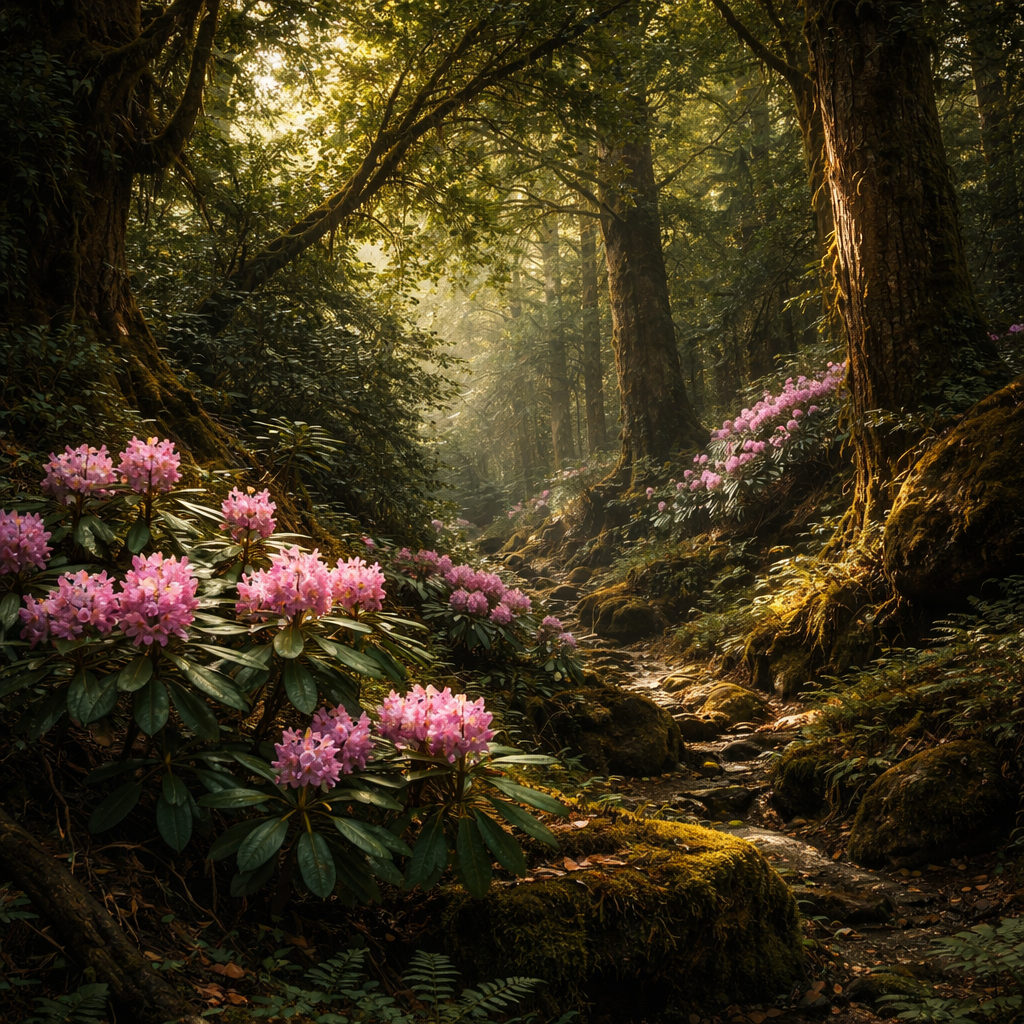 Rhododendrons in bloom under a canopy of trees in Appalachia