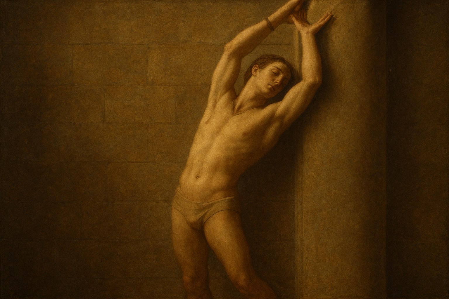 a painting of a naked man leaning against a wall