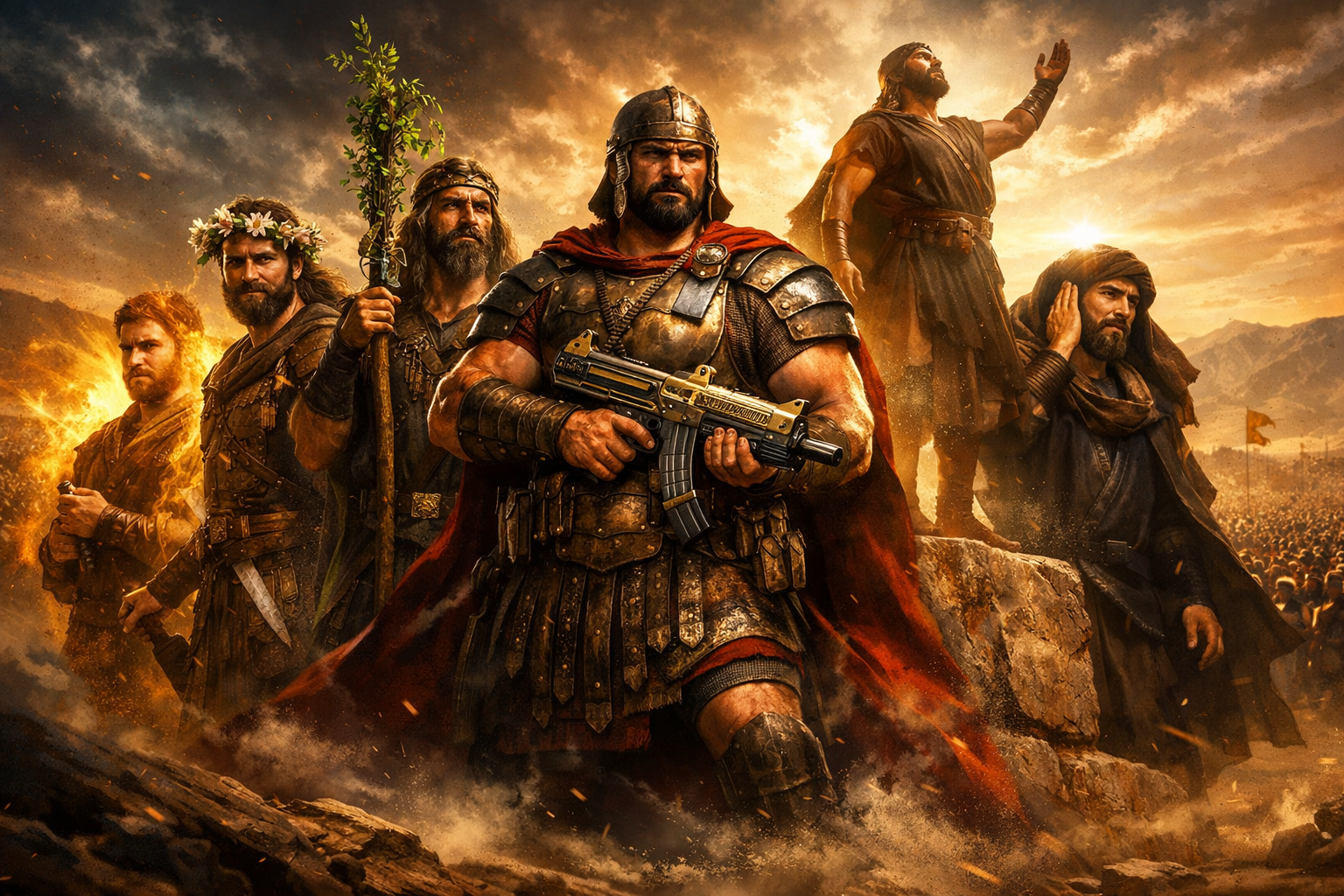 Prompt: A cinematic, hyper-realistic wide shot of six valiant biblical warriors, the sons of Tola, standing as "heads of their father’s house" in an ancient Levantine desert landscape. In the center, Uzzi is a massive, muscular commander clad in bronze armor, incongruously wielding a modern tactical Uzi submachine gun with gold engravings. Surrounding him are his brothers: Rephaiah holding a staff entwined with healing herbs; Jeriel standing atop a massive foundation stone looking toward heaven; Jahmai enveloped in a warm, protective golden aura; Jibsam wearing a garland of fragrant desert lilies; and Shemuel in a posture of listening, hand to his ear as if hearing a divine whisper. In the background, a vast army of 22,600 soldiers stretches to the horizon under the golden sun of King David’s era. Epic composition, dramatic chiaroscuro lighting, intricate leather and metal textures, 8k resolution, ArtStation style.